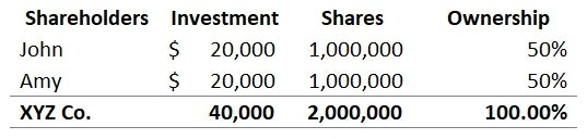 The equity percentage can be calculated based on the number of shares and shares outstanding. Lets say John and Amy decided to invest a total of USD 40,000 to start XYZ Co. and issued 1,000,000 shares each, John and Amy then owns 50% of XYZ Co. each, assuming they split the investment evenly :